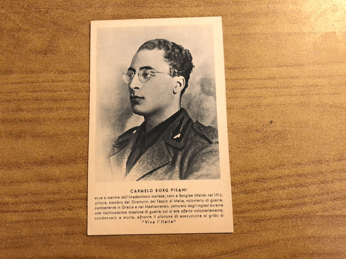 Fu in un contesto così incandescente che si affermò una delle figure più significative dell’irredentismo maltese filofascista: Carmelo Borg Pisani. Nato il 10 agosto 1914 in una famiglia filoitaliana, Carmelo trascorse infanzia e adolescenza fra Malta e Italia. Animato dal sacro fuoco della passione politica e dall’amore per l’Italia e la sua cultura, già a quattordici anni si iscrisse alla OGIE (Organizzazioni giovanili di italiani all’estero). Era anche un assiduo frequentatore della Casa del Fascio di La Valletta, dove – sotto la guida del Professor Umberto Biscottini – collaborò all’Archivio Storico di Malta. Nel 1930 lo troviamo presso il Campo Dux di Viareggio, mentre due anni dopo seguì a Roma un corso per diventare “Capo centuria”.